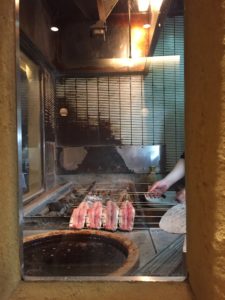 店内はほとんどがテーブル席なのですが、奥に3人~4人分のカウンター席が設けられています。おひとり様の私はもちろん毎回、カウンターに通されるのですが、もし空いていたら、一番手前に座ることをおすすめします。目の前のガラス越しにライブキッチンが広がるからです。握りハチマキをしたお兄さんが一心不乱に串刺しの鰻を炭火で焼いているシーンを楽しむことができます。
