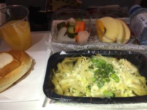 これは、なかなか美味しかったです。かなり熱々の出来たてでしたが、パスタは伸びていませんでしたし、味付けもグッド!太麺なので、伸びにくいのかも知れませんが、機内という不利な条件でも、美味しく食べられるようにメニューが工夫されているなと感心しました。