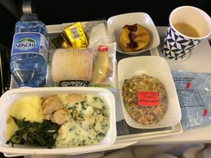 国際線の長距離路線では、経験上、2回の温かい食事が提供されるはずと予想していましたが、期待通り、1回目はこんな感じ。
