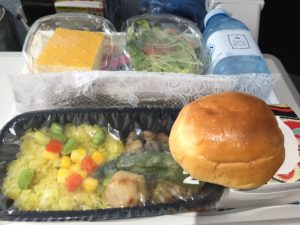 ピラフにサラダ、そしてデザートまで付いて、思ったより豪華ですね。ピラフはカレー味のように見えますが、味は忘れてしまいました。クラスはもちろんエコノミーです。これを見る限り、ビジネスクラスは、相当豪華なことが予想されます。