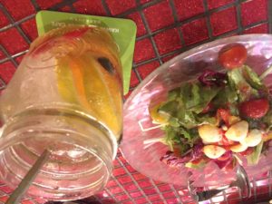 こちらが、注文の品。この手のエンタメ施設で生野菜のサラダが注文できるのは奇跡と言ってもいいでしょう。メニューで見つけた時は半信半疑でしたが、いい意味できたいはすでした。